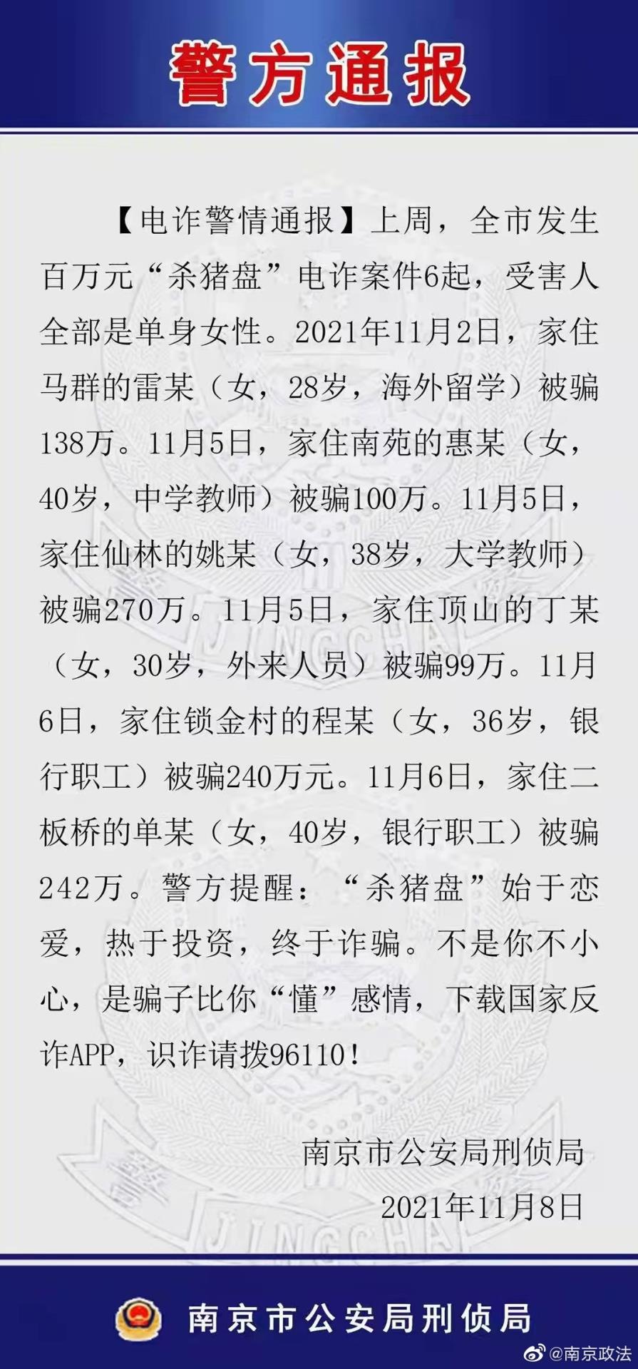 南京市委政法委官方微博11月8日下午发布的一则电诈警情通报显示,上周,南京全市发生百万元及以上“杀猪盘”电诈案件6起,受害人全部是单身女性,其中一名大学教师被骗270万元。6起案例分别为:2021年11月2日,家住马群的雷某(女,28岁,海外留学)被骗138万。11月5日,家住南苑…