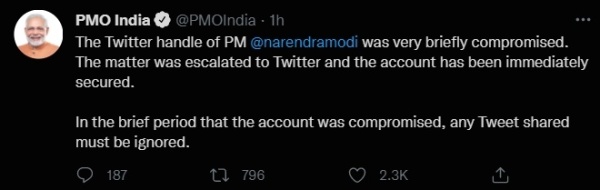 据《印度快报》12日报道,推特公司发言人当天表示,在被黑客攻击几小时后,莫迪的账号便恢复使用,“我们与总理办公室保持全天沟通,并已经采取必要措施,保证总理私人账号的安全”。但推特公司没有提及莫迪个人账号被黑客攻击的确切时间、持续多久以及黑客发的假推文何时被移走等内容。