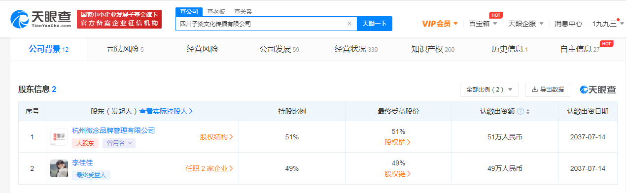 天眼查信息显示,10月25日,四川子柒文化传播有限公司与刘同明,杭州微念品牌管理有限公司相关案件新增立案信息,一审原告为四川子柒文化传播有限公司,一审被告为杭州微念品牌管理有限公司,刘同明。经办法院为四川省绵阳市中级人民法院。股东信息显示,四川子柒文化传播有限…