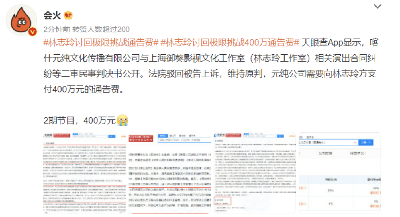 24日,有媒体在社交平台上发文称林志玲讨回《极限挑战》的400万通告费。据悉,林志玲所录制的那一期节目是在2017年,两期节目通告费共计400万元。同时,据天眼查显示,近日,喀什元纯文化传播有限公司与上海御葵影视文化工作室(普通合伙)相关演出合同纠纷等二审民事判决书公…