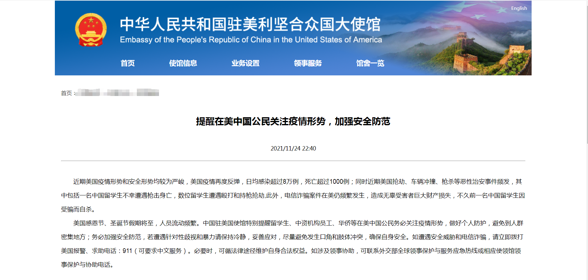 每经编辑:毕陆名当地时间11月24日晚间,中国驻美国大使馆发布提醒称,近期美国疫情形势和安全形势均较为严峻,美国疫情再度反弹,日均感染超过8万例,死亡超过1000例;同时近期美国抢劫、车辆冲撞、枪杀等恶性治安事件频发,其中包括一名中国留学生不幸遭遇枪击身亡,数位留学…