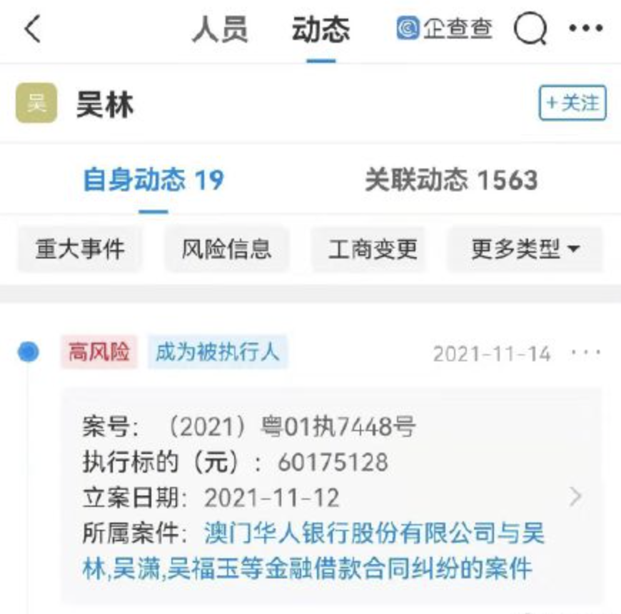 据企查查显示,近日,吴亦凡表哥吴林等新增被执行人信息,执行标的60175128元,关联案件为吴林、吴潇等与银行的金融借款合同纠纷。此外,本案被执行人还包括吴福玉、广东万迪公路工程有限公司。