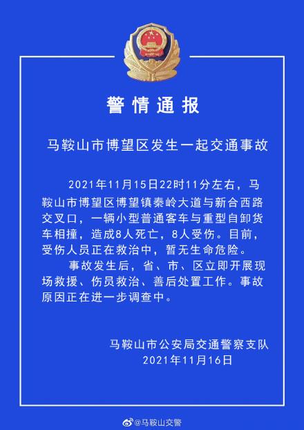 安徽省马鞍山市公安局交警支队官方微博11月16日通报一起交通事故:一辆小型普通客车与重型自卸货车相撞,造成8人死亡,8人受伤。目前,受伤人员正在救治中,暂无生命危险。事故发生后,省、市、区立即开展现场救援、伤员救治、善后处置工作。事故原因正在进一步调查中。