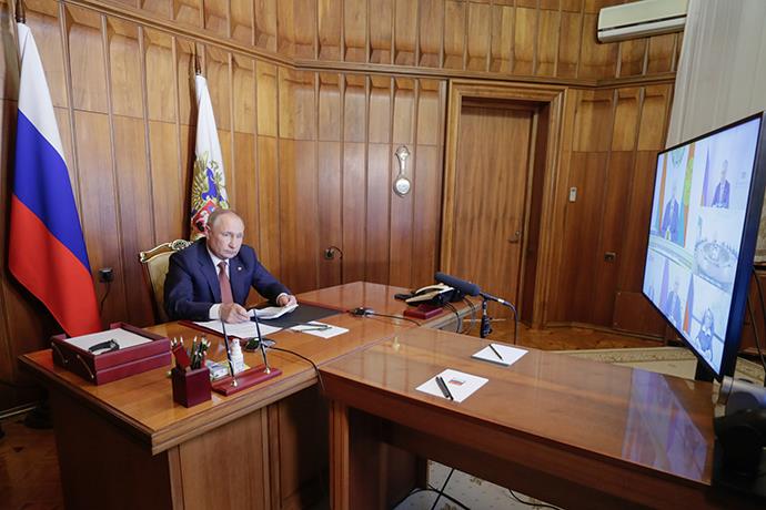 当地时间2021年11月4日,克里米亚塞瓦斯托波尔,俄罗斯总统普京出席俄白两国联盟国家最高国务委员会视频会议。澎湃影像 图当地时间11月4日,俄罗斯总统普京和白俄罗斯总统卢卡申科在俄白两国联盟国家最高国务委员会视频会议上签署了一系列文件,其中包括联盟国家一体化法令、联…